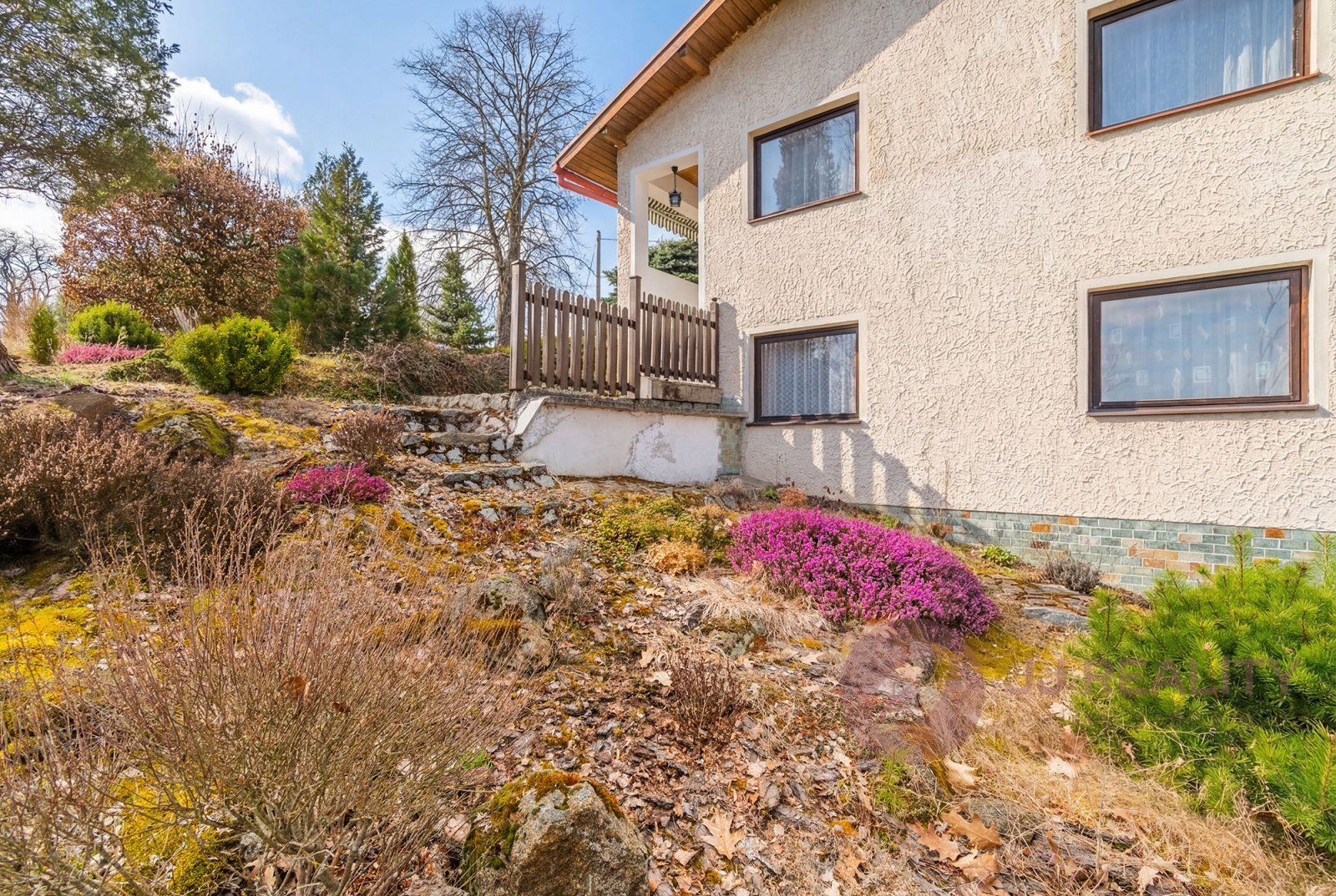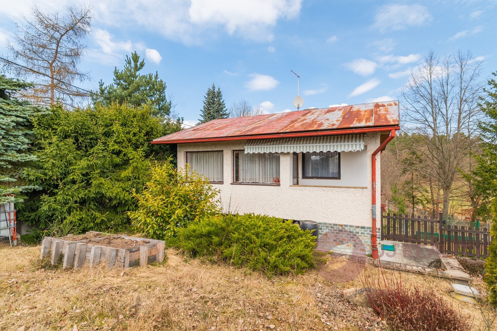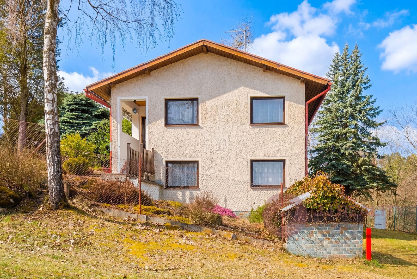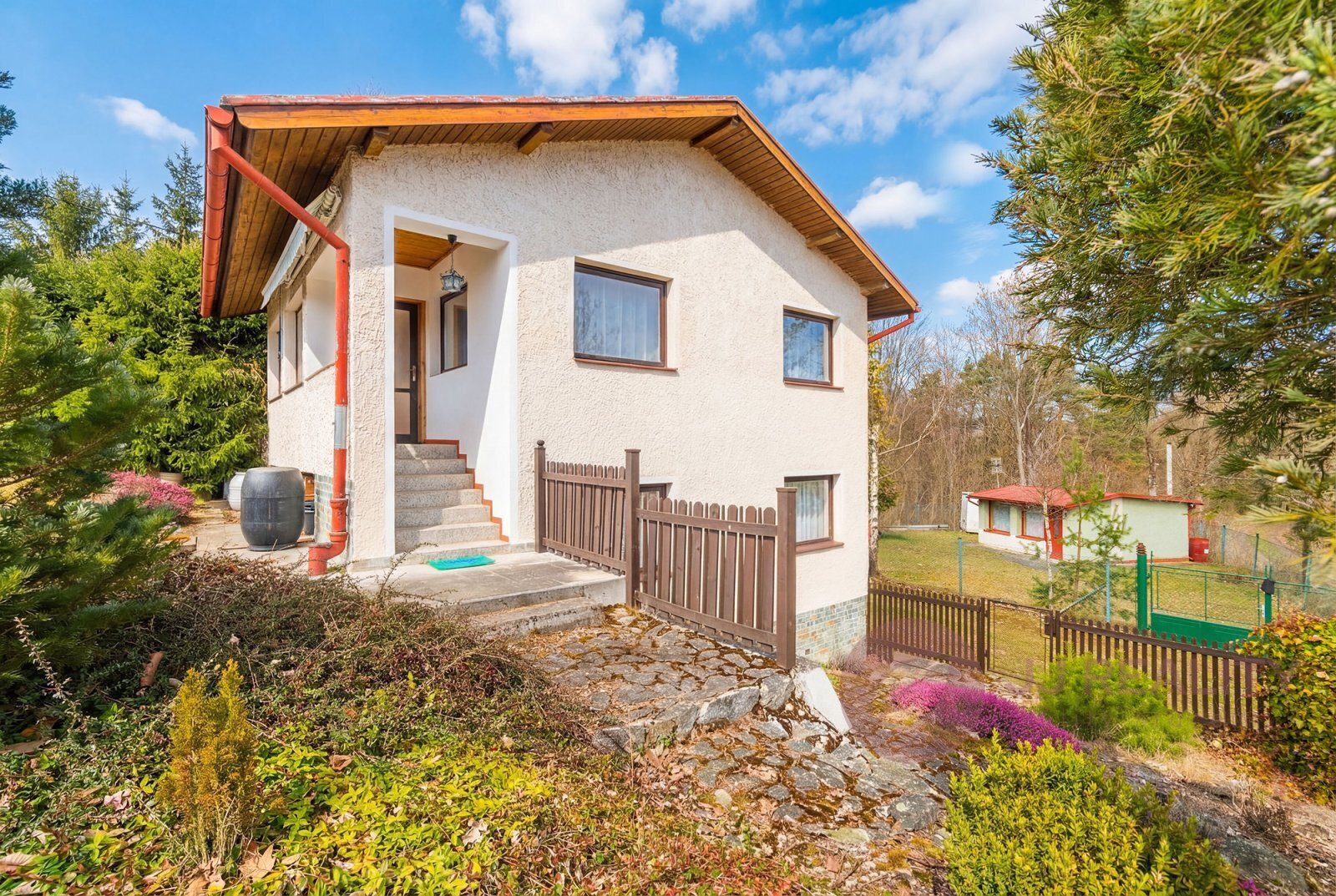 Chata stojí na vlastním slunném pozemku o výměře 358 m², který je citlivě osázen keři a stromy, a vytváří tak příjemné zázemí pro odpočinek i zahradní posezení. Nemovitost je ve velmi pěkném a udržovaném stavu a je připravena k okamžitému užívání.