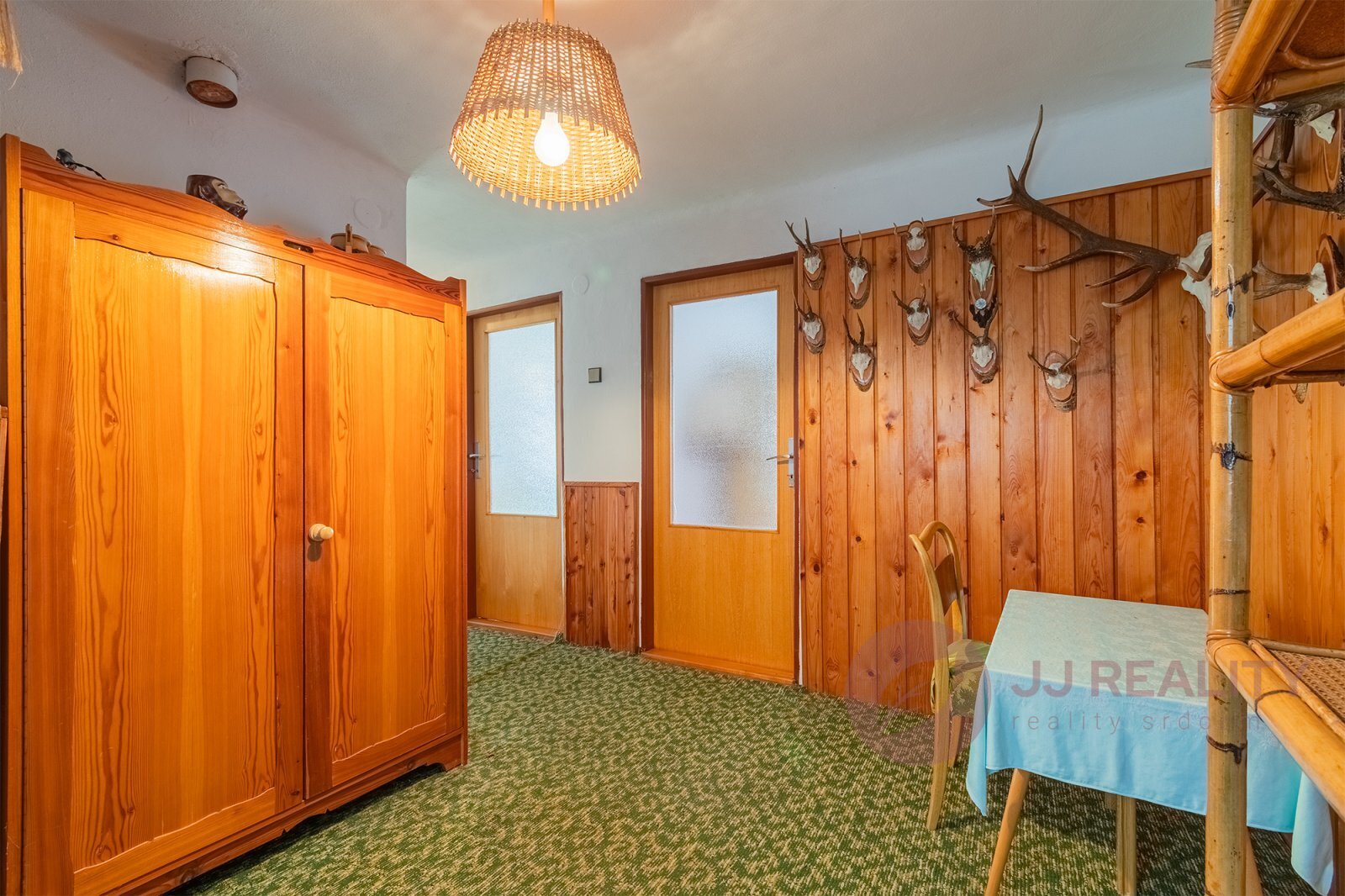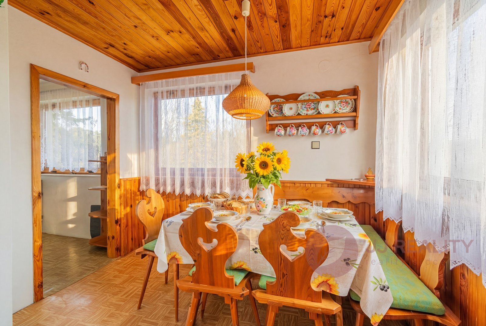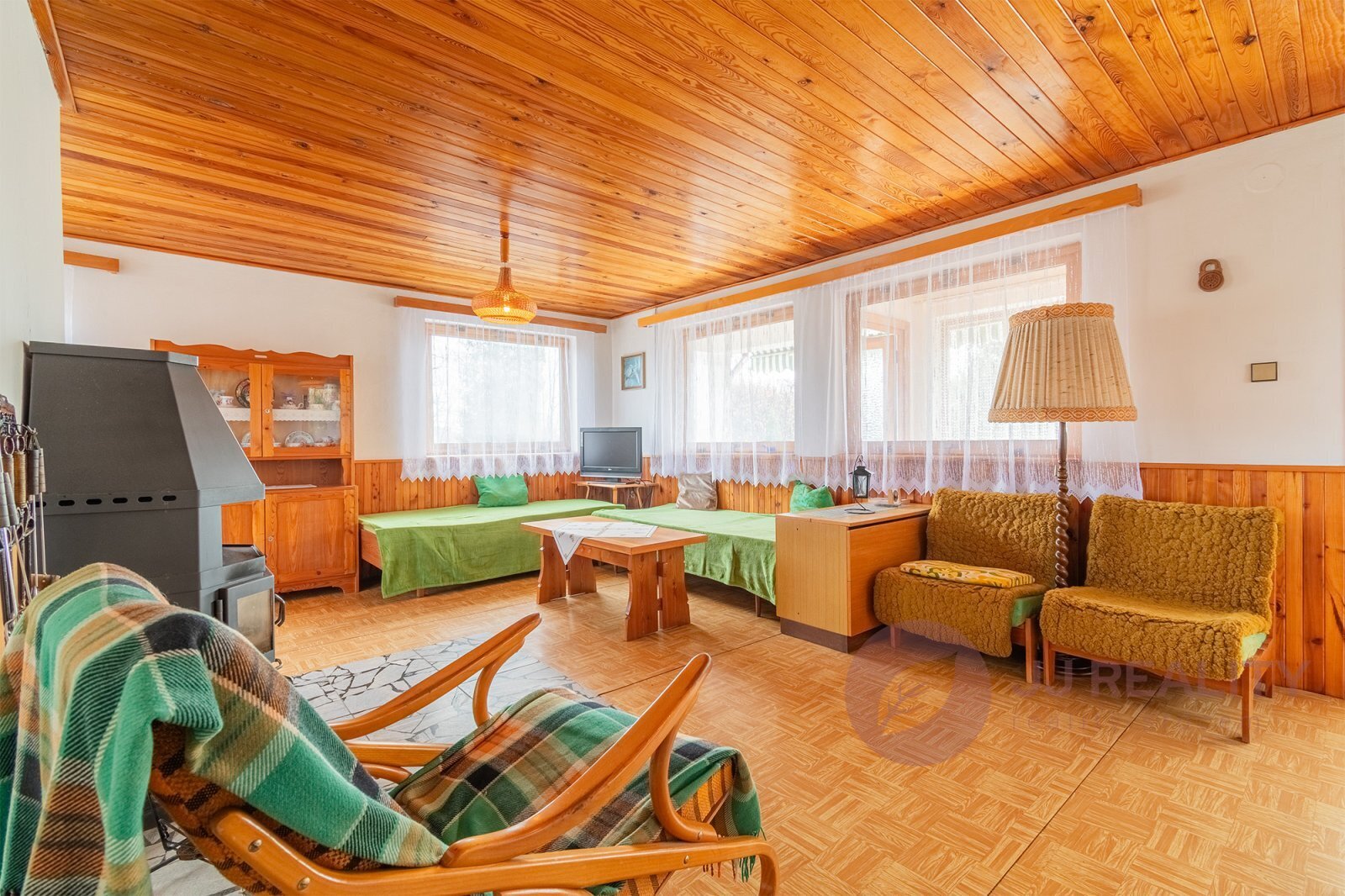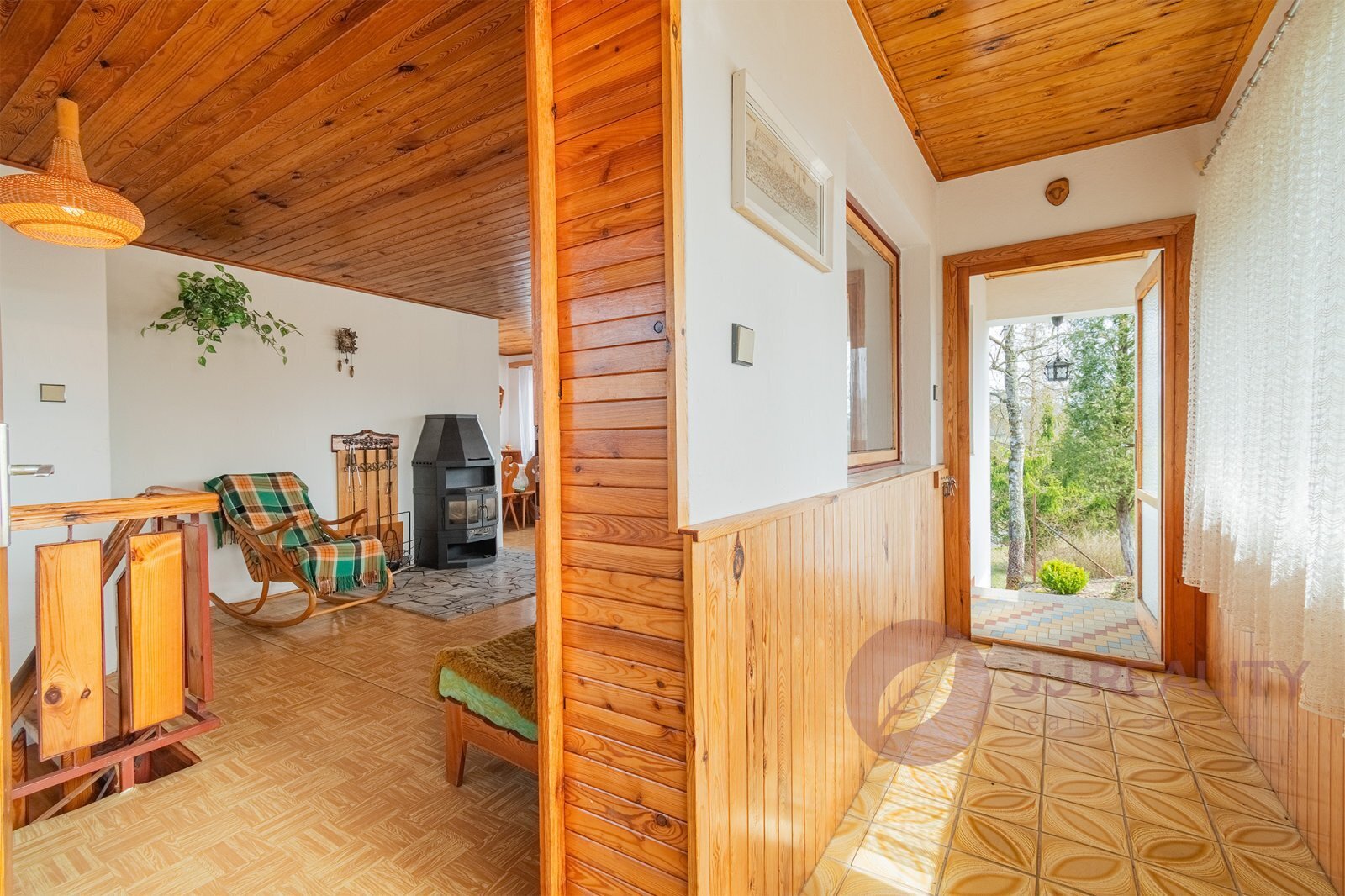 Dispozice chaty je prakticky řešena. V přízemí se nachází tři samostatné místnosti, prostorná hala a schodiště vedoucí do patra. Horní podlaží nabízí velkorysý obývací pokoj propojený s jídelnou a kuchyní, dále koupelnu, WC a chodbu se vstupem na zahradu.